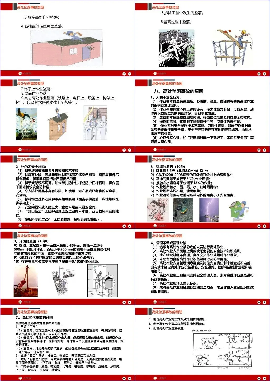 高处作业最易发生的事故为高处坠落和落物打击。文档详细列举了九种坠落类型(如脚手架坠落、屋面坠落、梯子坠落等),并从“人、物、环境、管理”四个维度深入剖析事故成因,如人员违章、防护用品缺陷、恶劣天气、管理制度缺失等。