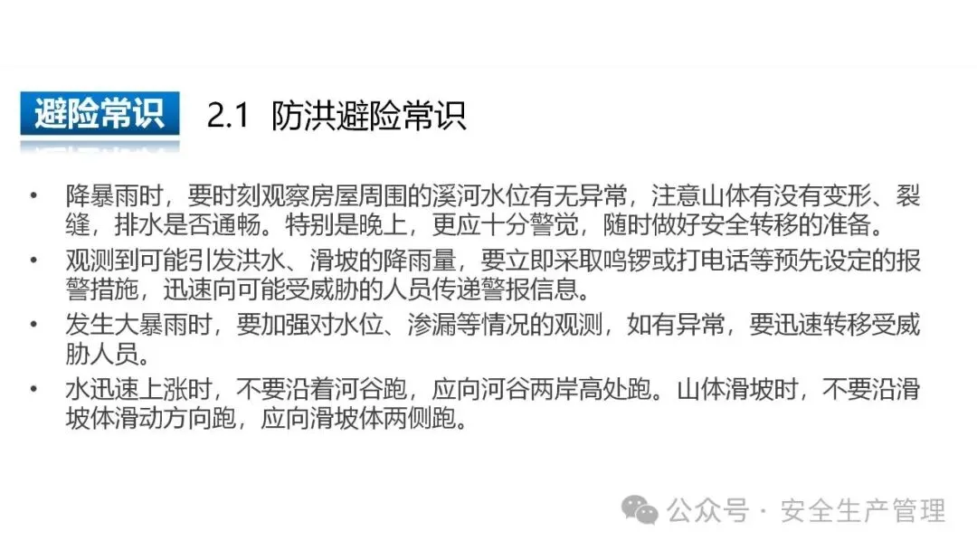 山洪与滑坡:山区暴雨易引发山洪、滑坡、泥石流等灾害,当发现山体出现裂缝、泉水突然断流或涌出、山坡上的树木歪斜等异常情况时,立即撤离至安全地带。撤离要点:向地势较高、远离河道和陡坡的方向转移,撤离时携带必要的物资,保持冷静,不要贪恋财物,听从当地政府和防汛部门的指挥。