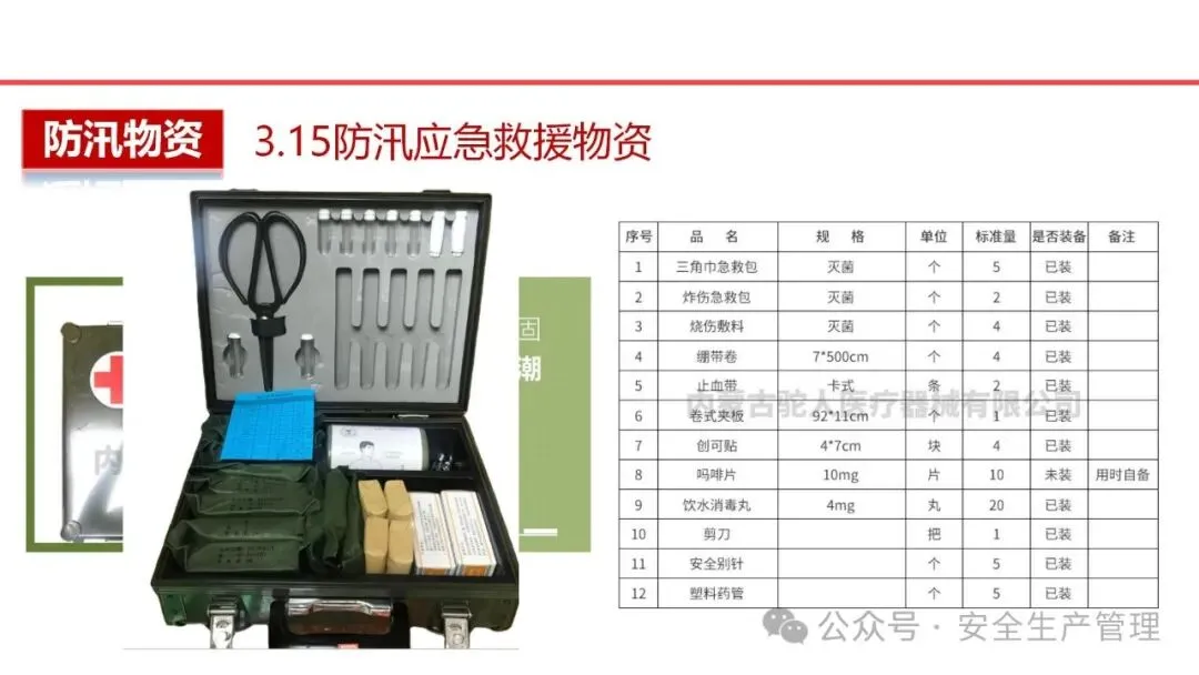 必备物资:编织袋、沙袋(用于挡水)、铁锹、雨衣、雨靴、手电筒、应急灯、备用电池、饮用水、方便食品(如压缩饼干、罐头等)、常用药品(感冒药、退烧药、肠胃药、消毒用品等)。特殊物资:针对有老人、儿童的家庭,准备婴儿奶粉、尿布、老人常用药品等;有条件的可配备救生衣、救生圈、防水手机袋等。