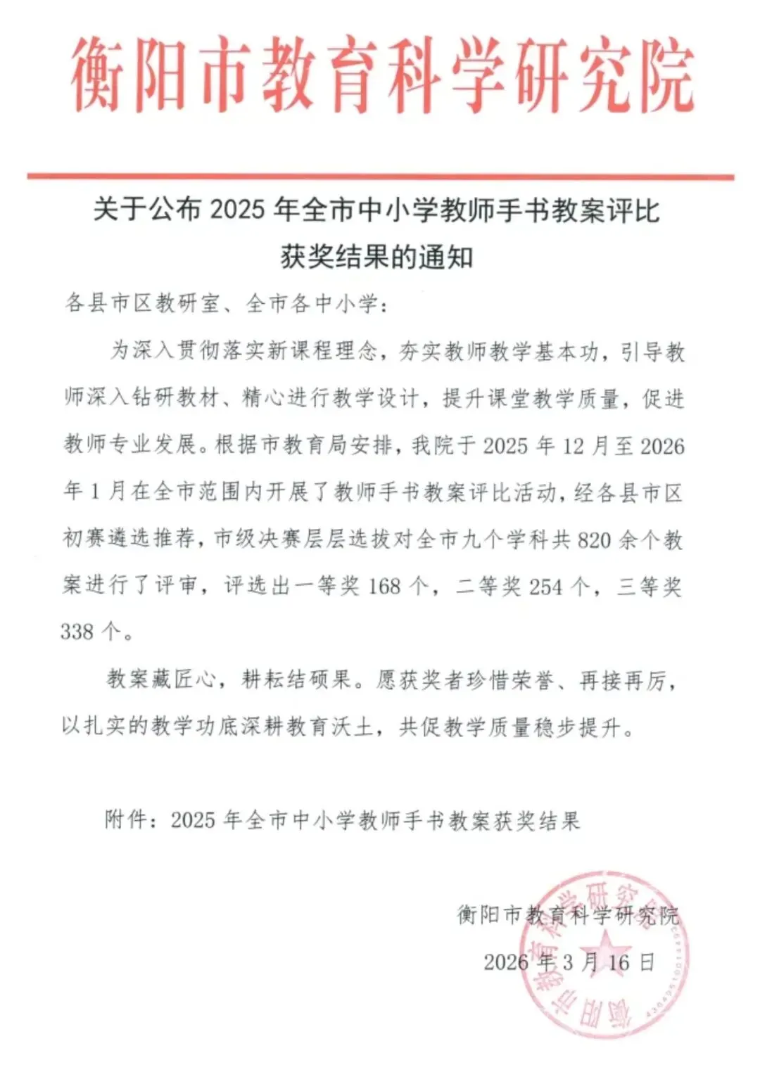 >恭贺!衡阳市2025年中小学教师手书教案评比获奖