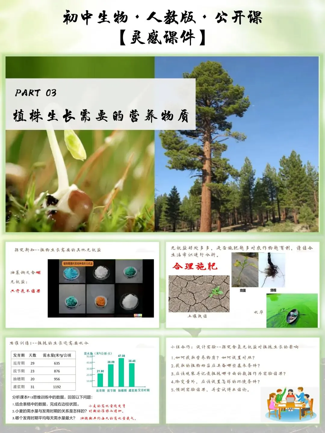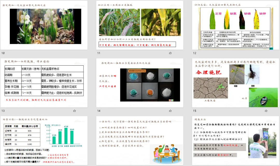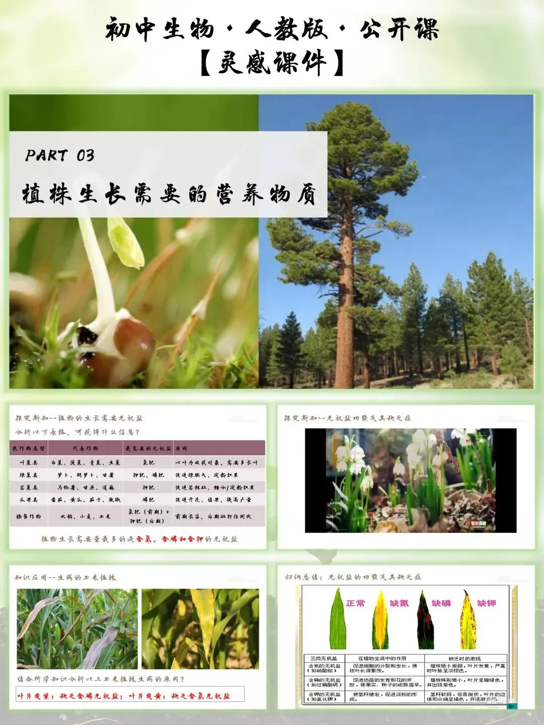 植物需要的无机盐种类多、功能杂,学生容易记混,课件用 “表格梳理 + 实例对应” 的方式,让知识清晰易懂: