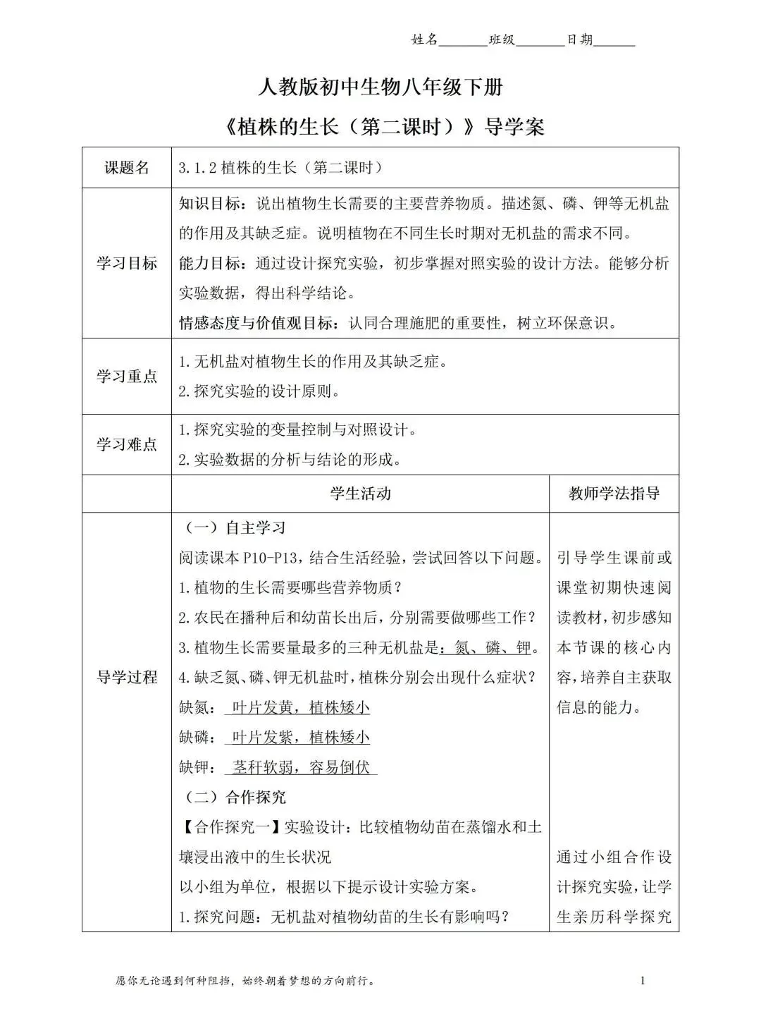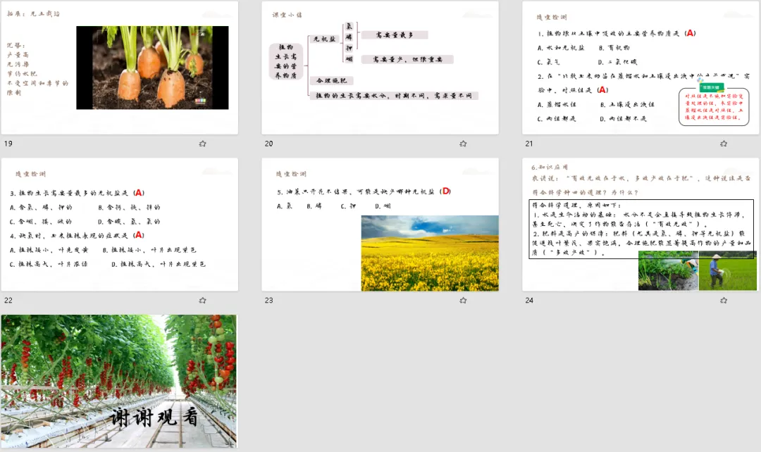 分类表格:整理出叶菜类、根菜类、瓜果类等不同作物对无机盐的需求差异,比如白菜、菠菜需氮肥(促叶生长),萝卜、甘薯需磷钾肥(促根膨大),让学生结合作物收获部位理解需求;