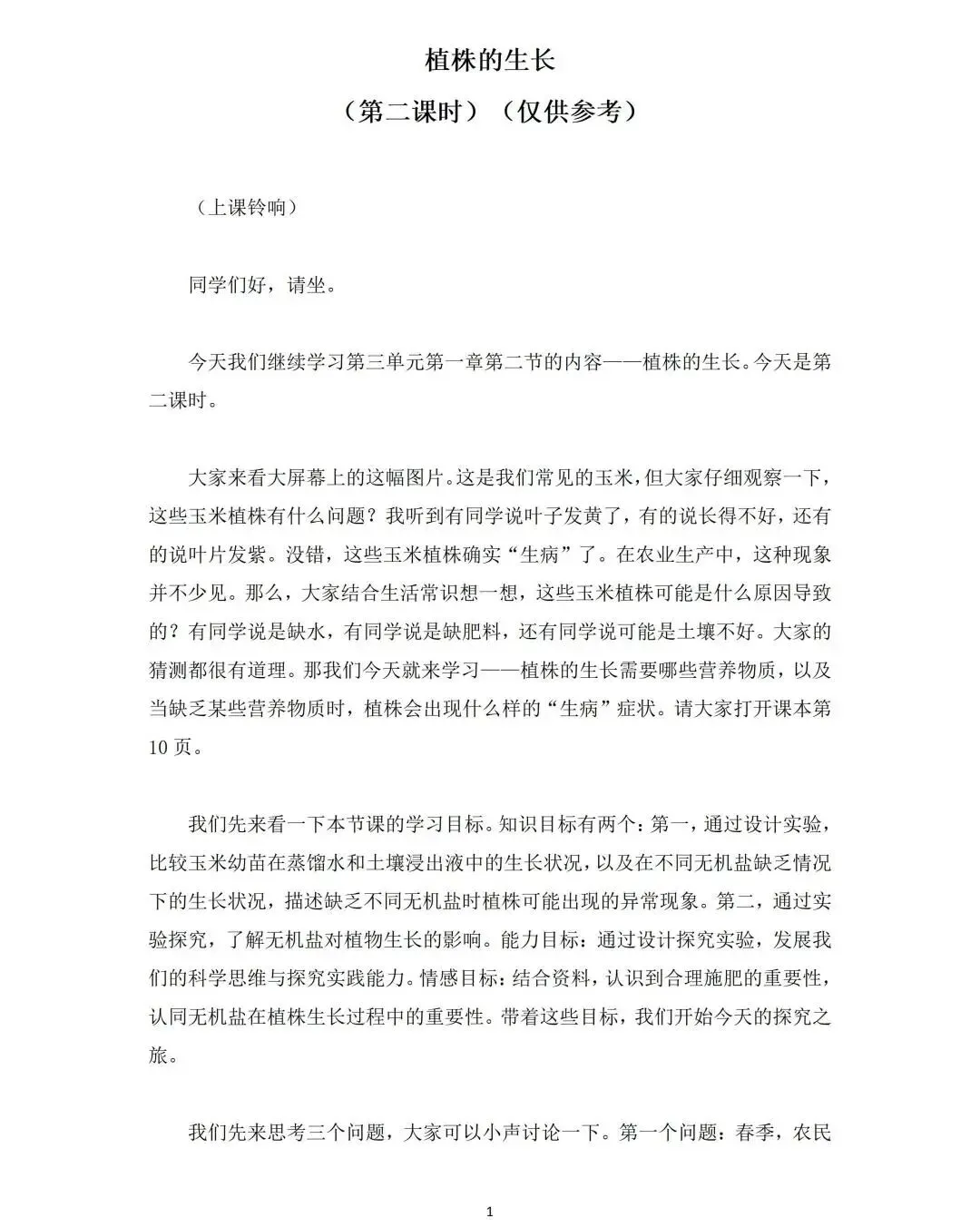没有生硬铺垫,而是用植物 “生病” 的生活化场景制造悬念,自然引出 “植株生长需要无机盐” 的核心主题。学生带着 “给植物治病” 的心态进入学习,比被动听理论更有动力,也为后续知识点的讲解做好了情感铺垫。