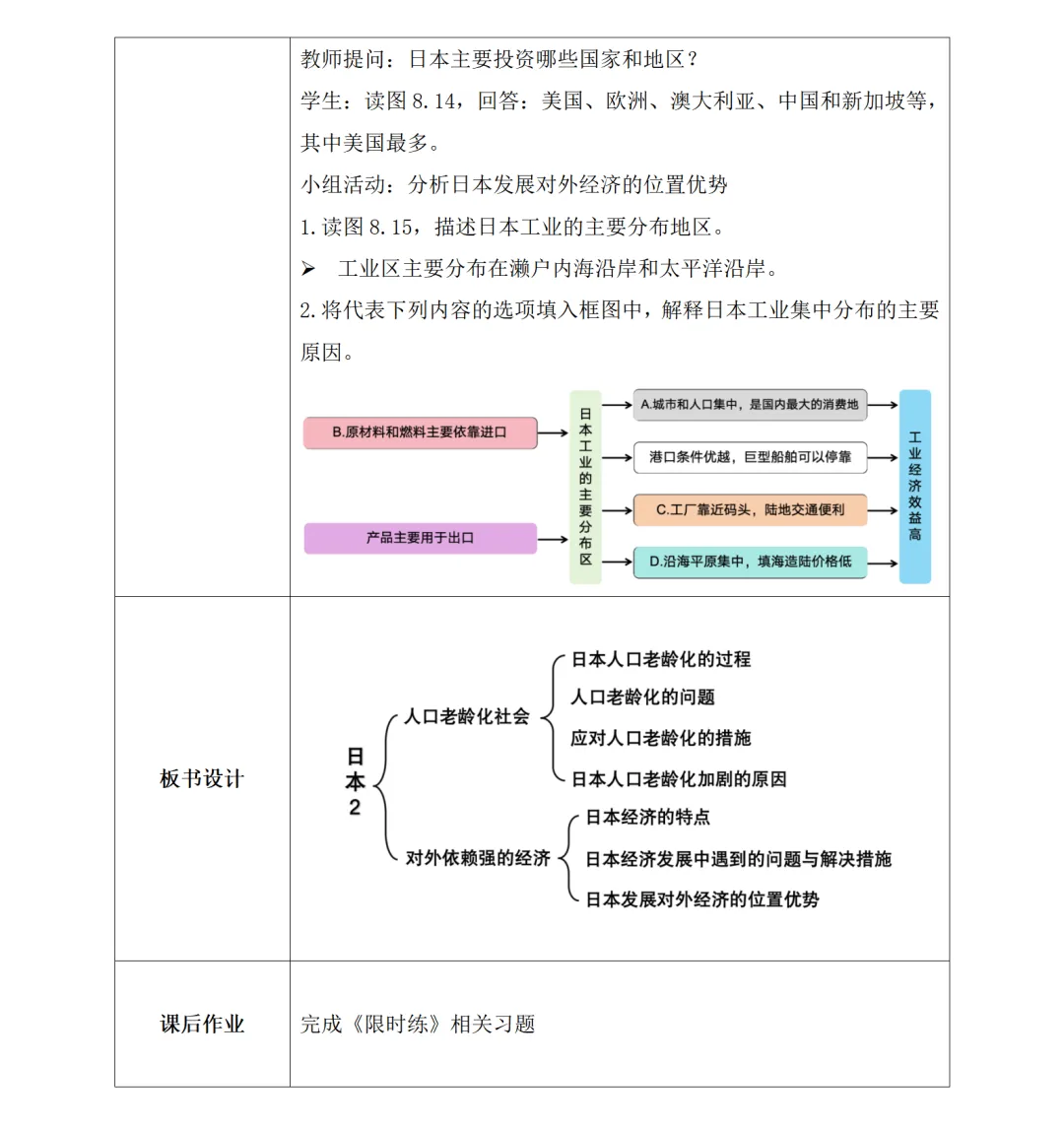 从生活中日本产品切入,提炼日本经济 “大量进口原材料燃料、加工后出口工业产品” 的核心特点;解析成因 —— 国土狭小、资源贫乏导致国内供给不足,而劳动力素质高、科技发达为加工制造提供支撑;明确原材料进口来源(铁矿石来自澳、巴等,石油来自中东等)与工业产品出口地(亚、欧、北美)。