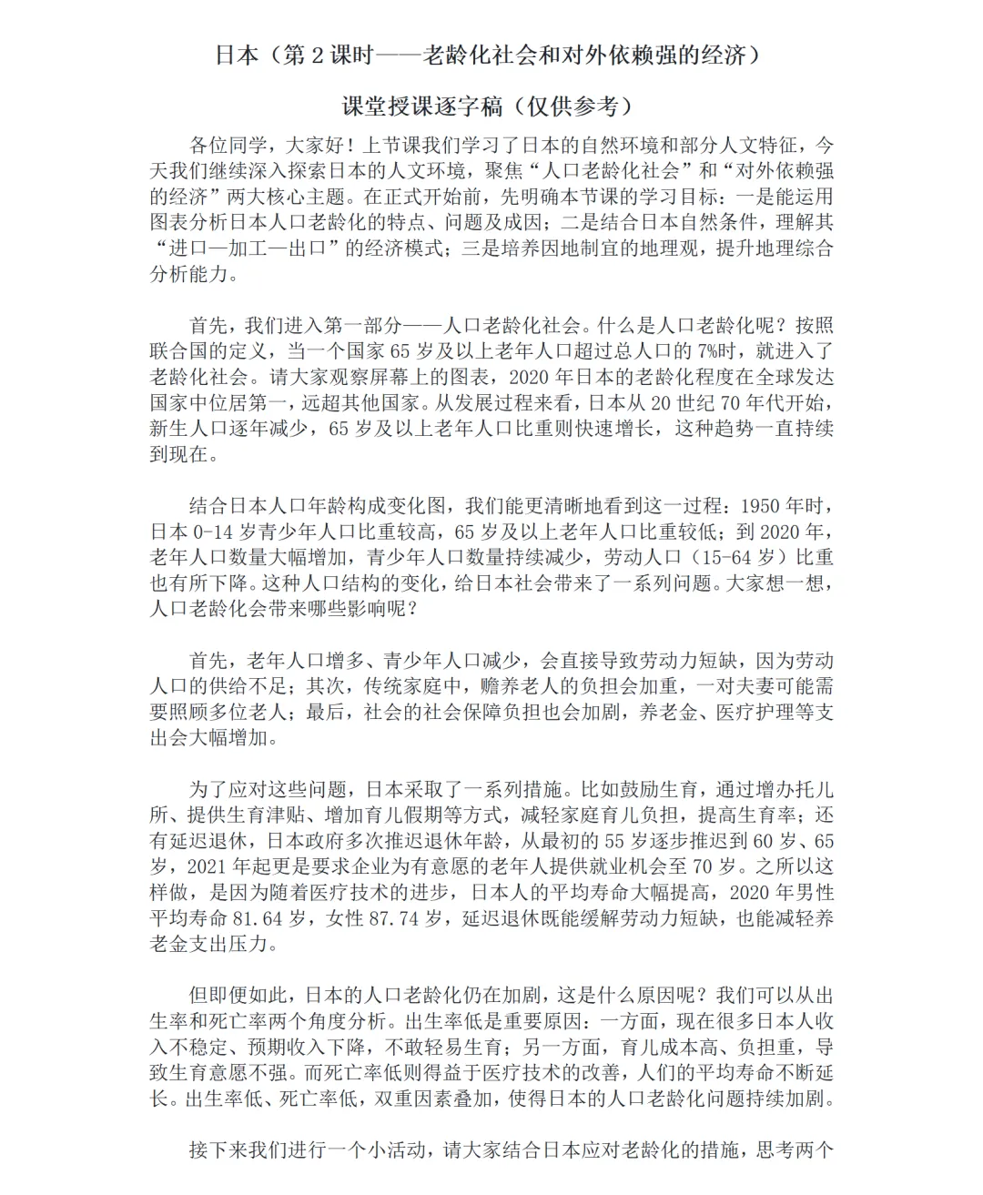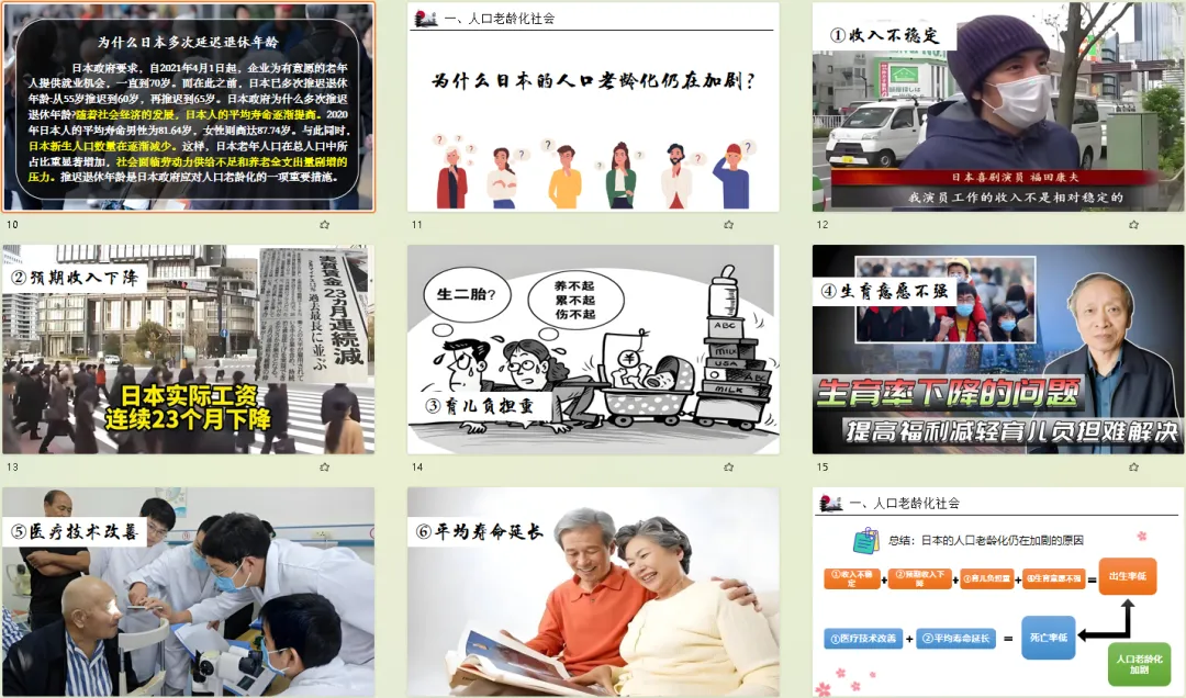 明确老龄化社会的联合国定义(65 岁及以上人口超总人口 7%),梳理日本老龄化 “始于 20 世纪 70 年代、2020 年居全球第一” 的发展过程;分析出生率低(育儿负担重等)、死亡率低(医疗进步等)的加剧成因;点出劳动力短缺、养老与社保负担加重的核心问题,以及鼓励生育、延迟退休的应对措施,知识体系清晰。