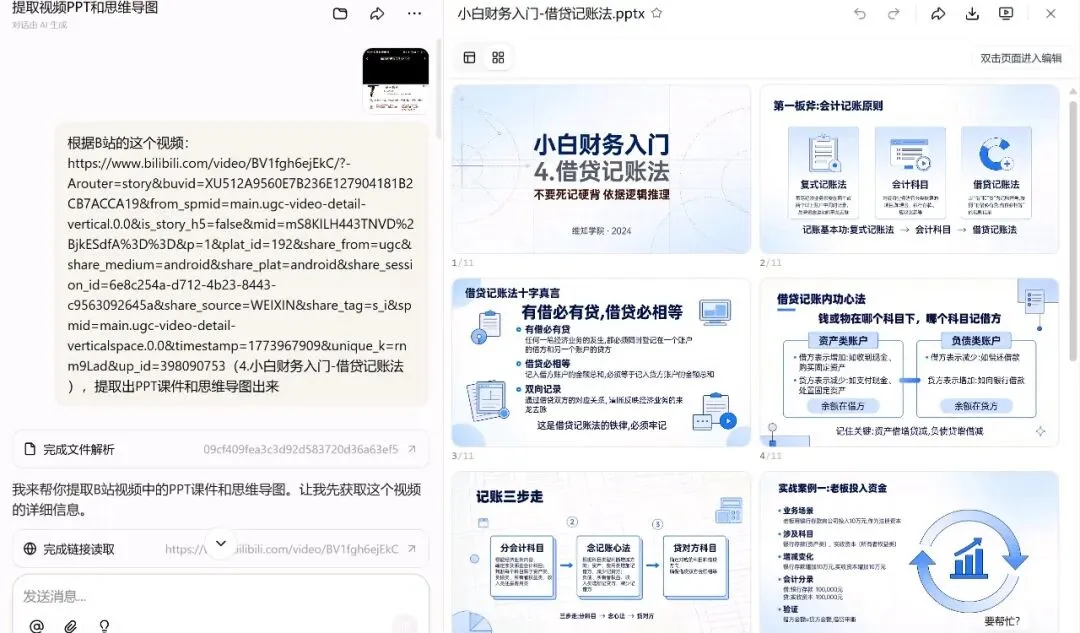 最近在学财务知识,在b站上搜了搜还有有不错的老师讲解,通俗易懂。问题是视频里面的课件没有,不好复习和练习,于是用 deeoseek 和扣子分别试了下让它去提取视频中的课件,deepseek 还是重推理没有给我输出 ppt ,但是扣子可以直接给我 ppt,很好!,以后想提取b站老师视频中课件思维导图都可以这么干!
