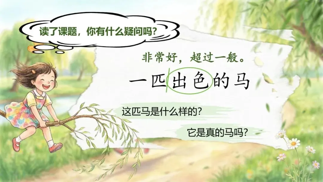师:是呀,出色就是"特别棒、非常好"的意思。这匹马,到底有多出色呢?让我们一起读课文去找找答案吧!