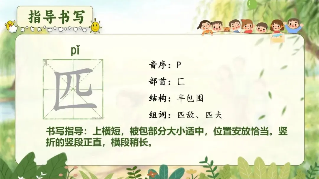 师:"匹"字的笔顺容易写错,我们一起来数一数,共4笔。注意第3笔是竖弯钩,可不是竖弯哦!外面的包围部分要写得稍大一些,竖折的竖段要直,横段稍长。可以对比"四"字——"匹"和"四"长得有点像,但"匹"的第3笔是竖弯钩,"四"里面是两个竖,注意区分!