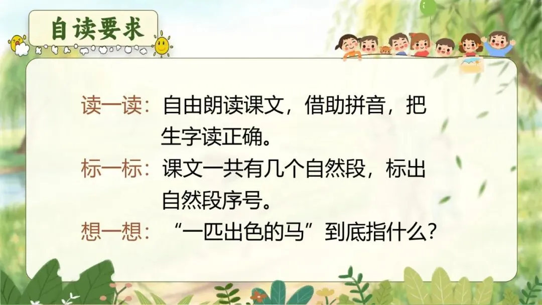 出示自读要求:① 借助拼音读准字音,读通句子。②标出自然段序号;③思考:"一匹出色的马"指的是什么?