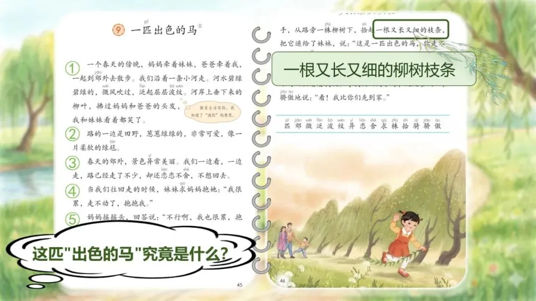 哇,一根又长又细的柳树枝条,就成了一匹出色的马!这可真有趣!为什么一根枝条能变成一匹出色的马呢?待会儿我们慢慢去发现。