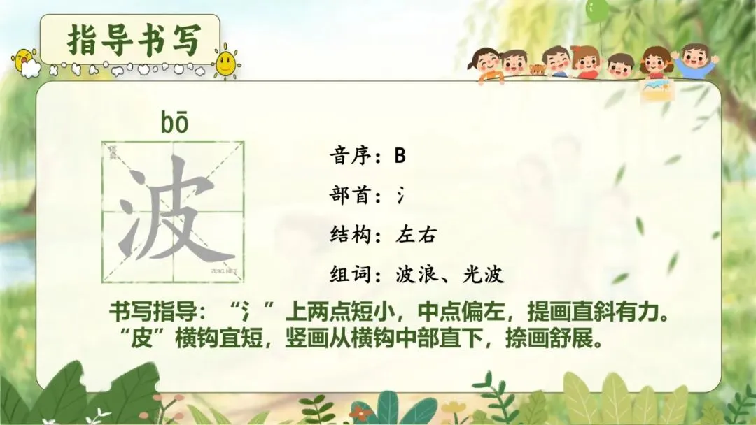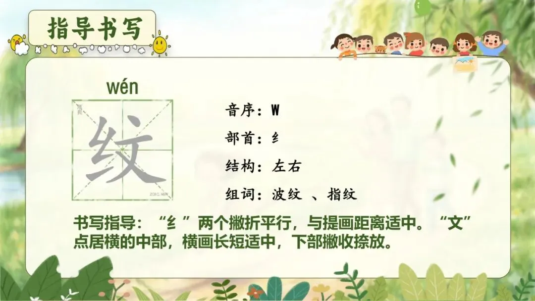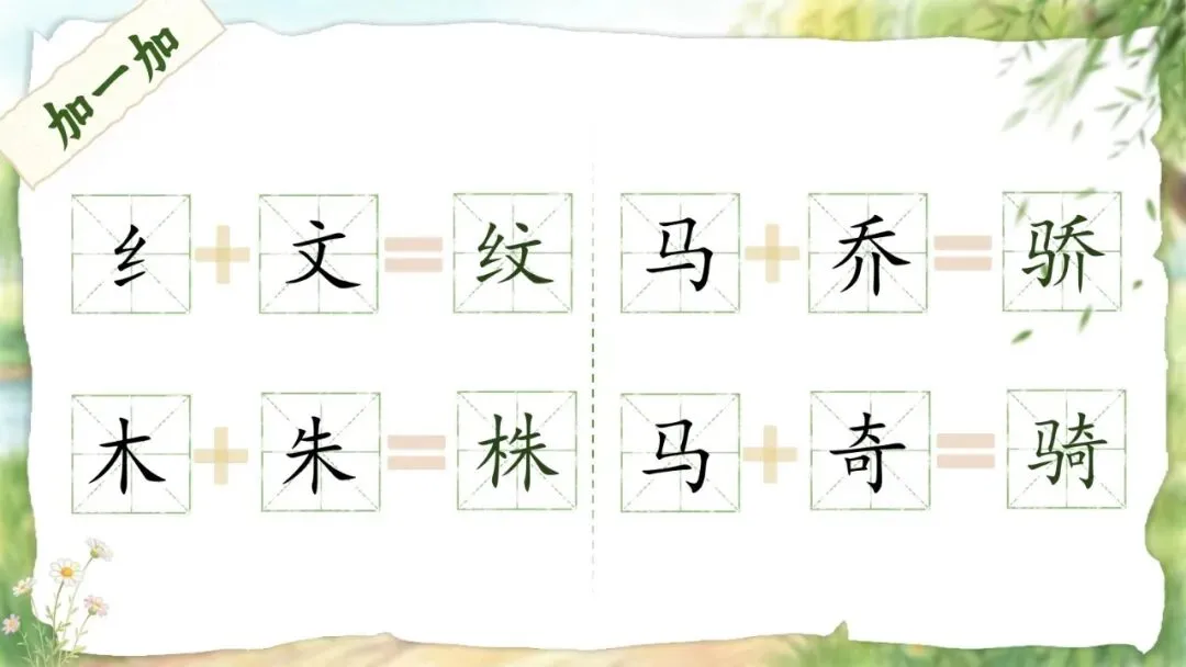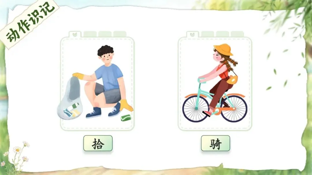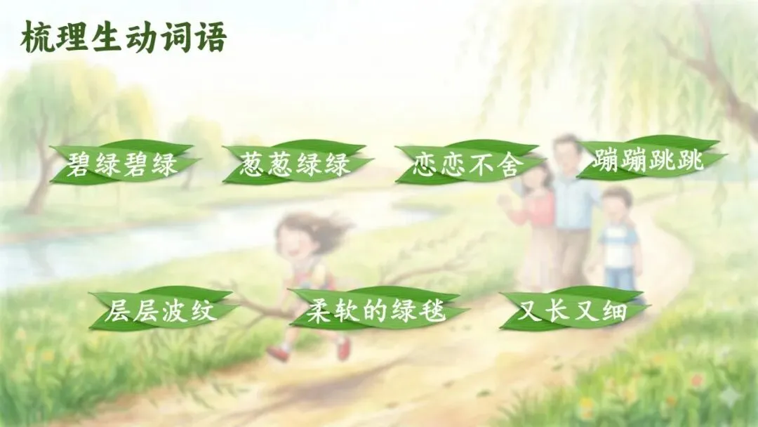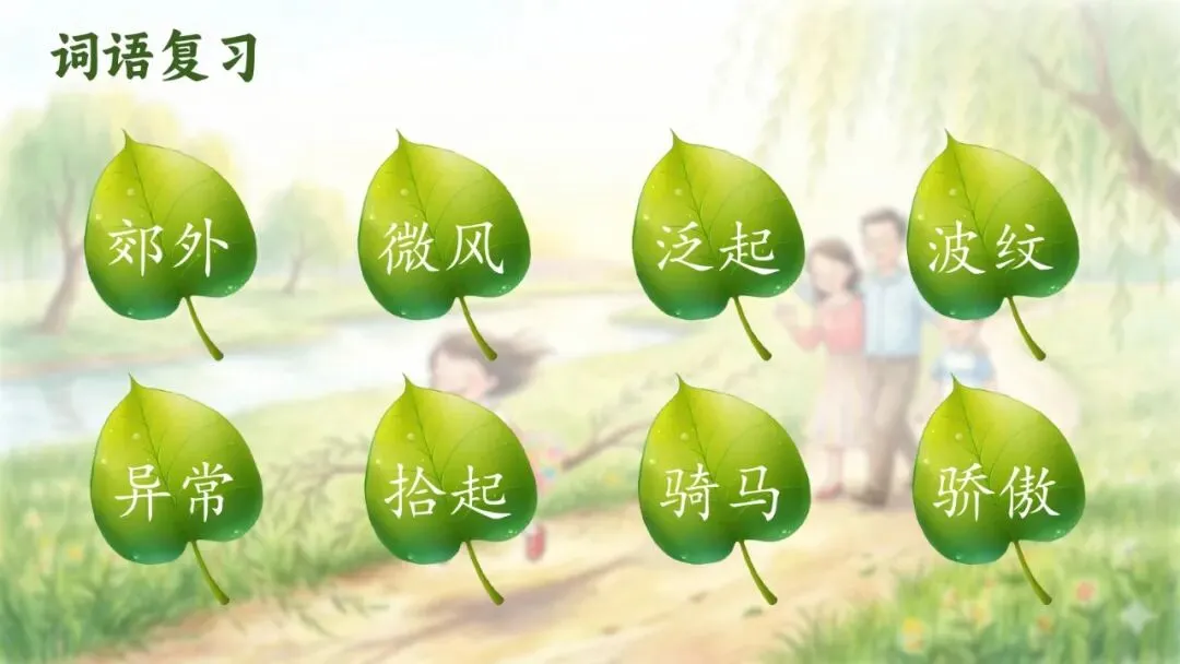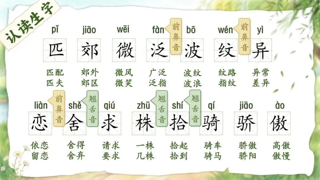 •识字教学扎实到位:全面落实了新版15个会认字的认读目标,重点区分翘舌音(舍、株、拾)和前鼻音(泛、纹、恋),采用随文识字的方式在语境中识记"泛、纹、恋、骑"等字,形义结合,避免孤立识字。