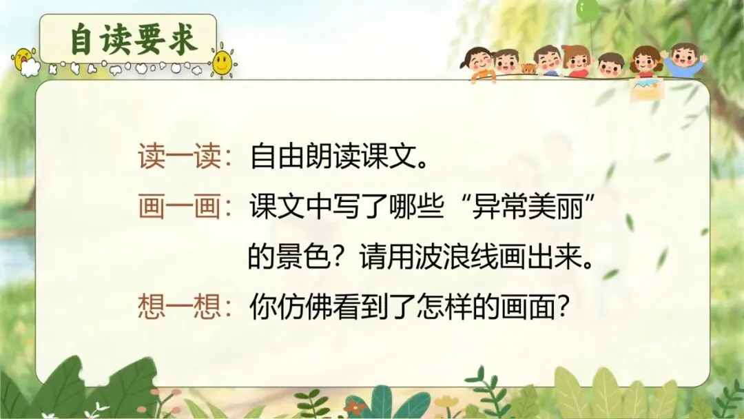 师:请大家自己读读第1、2自然段,找出描写景色的句子,画上波浪线。让我们一边读,一边在脑子里画出这些美丽的画面。