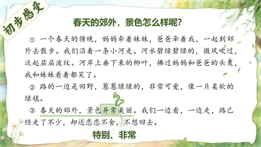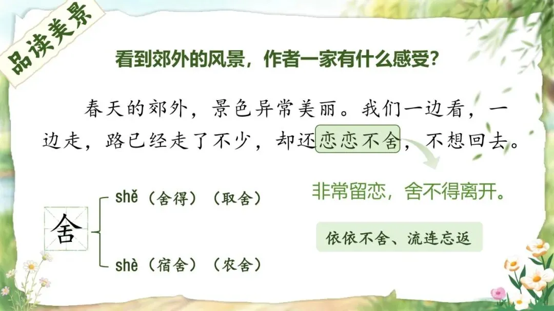 任务成果: 积累并能运用"碧绿碧绿、葱葱绿绿、恋恋不舍"等生动词语;选择一句描写郊外景色的句子抄写下来;能说出妹妹变化的原因,感受春日郊游中的美好亲情。