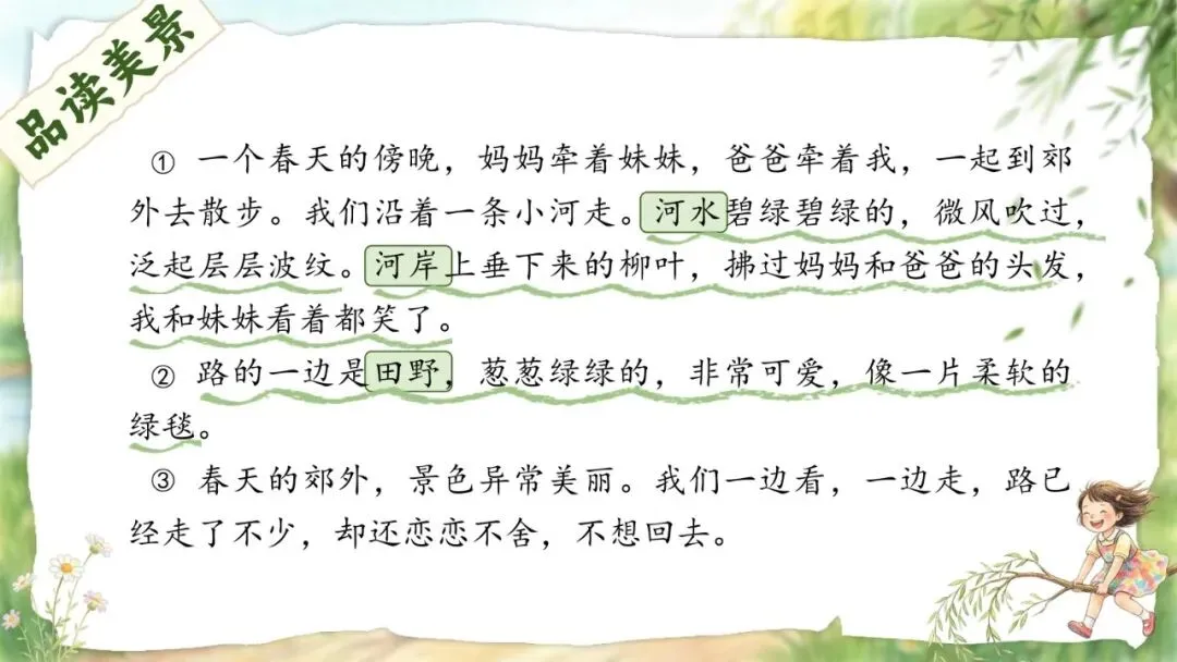 师:小小体验官们,你们看——一边是碧绿碧绿的小河,一边是葱葱绿绿的田野,柳叶轻轻拂过头发,一家四口走在这样美丽的小路上,多么幸福!难怪课文说——(生齐读)"路已经走了不少,却还恋恋不舍,不想回去。"