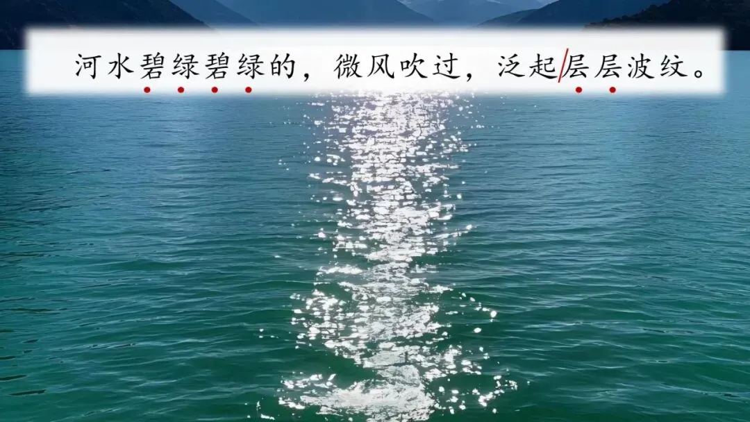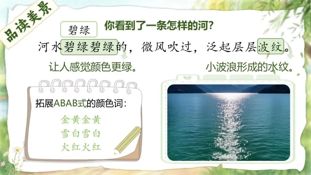 ② "碧绿碧绿"和"碧绿"有什么不同?碧绿碧绿说明河水更绿了,颜色深、颜色纯!读这个词的时候,要稍慢一点,读出那种绿意盎然的感觉。