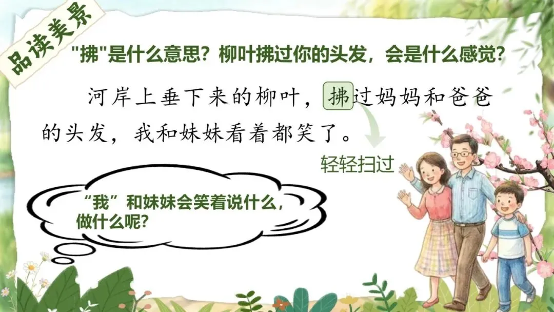 ① "拂"是什么意思?(轻轻扫过,像手轻轻摸一下。)柳叶拂过你的头发,会是什么感觉?(生:凉凉的,软软的,像被轻轻抚摸。)