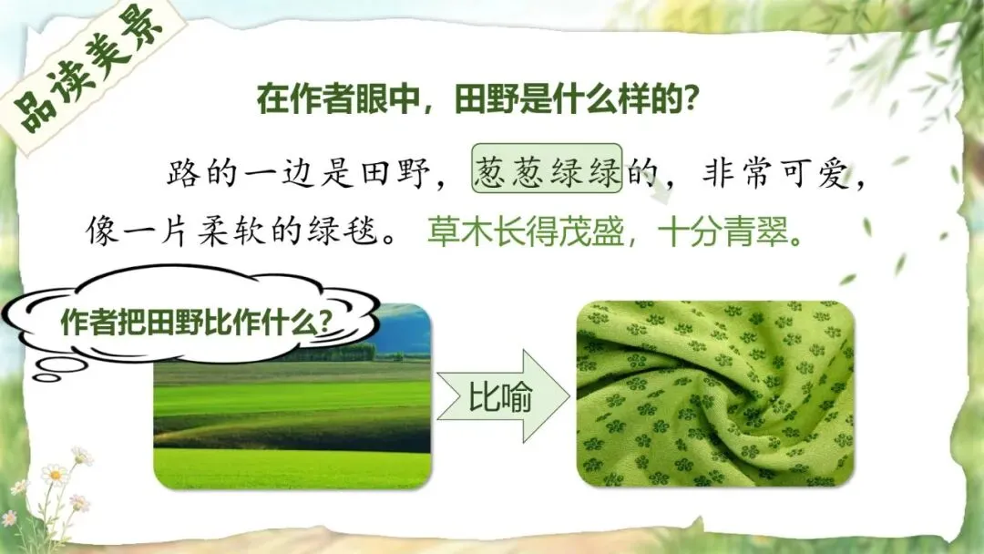③ 指导朗读:读"柔软"时声音放轻柔,读"绿毯"时稍微重读,让大家感受到那片茂盛美丽的田野。(师生合作读——齐读)
