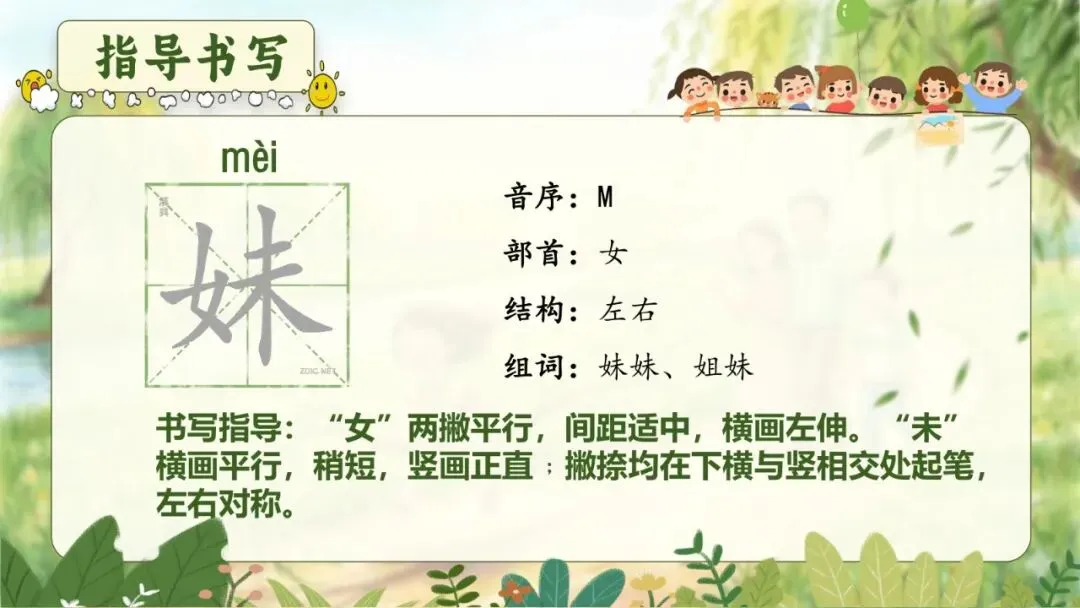 师:“人”撇捺舒展。下部横向笔画大致均匀,“口”上宽下窄,大小适中。上下中心对齐,重心安稳。