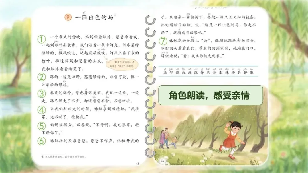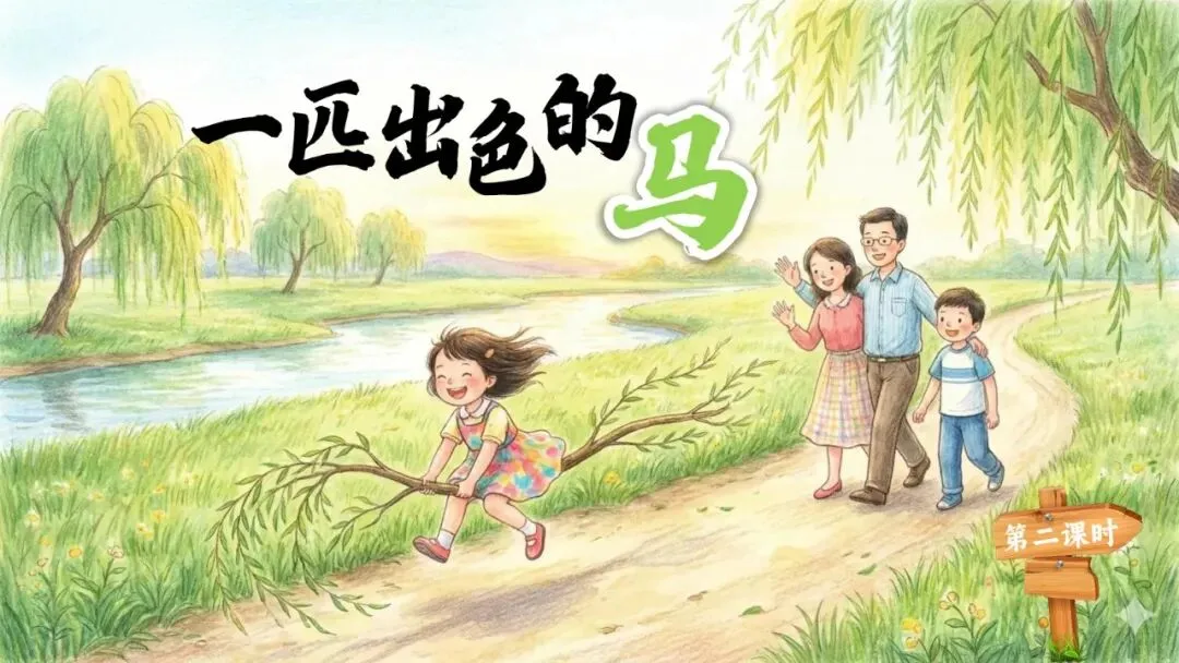 《一匹出色的马》是一篇清新优美的短篇散文,作者陈伯吹以"我"的口吻,讲述了一家四口春日郊游,返程时疲累的妹妹在爸爸的妙招下骑着"一匹出色的马"(柳枝)欢快回家的故事。