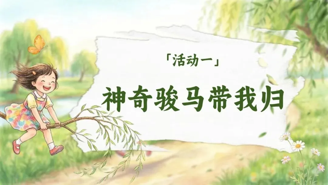 师:今天我们完成了"骑上春日之马"的体验项目!我们不仅读懂了妹妹从累到骄傲的变化,感受到了爸爸满满的智慧与爱,还积累了"碧绿碧绿、葱葱绿绿、恋恋不舍"等美丽的词语,写下了最喜欢的春日美景。"奇妙童心体验营"的第二个项目,大家出色地完成了!让我们期待第三个项目——聆听树上童话!
