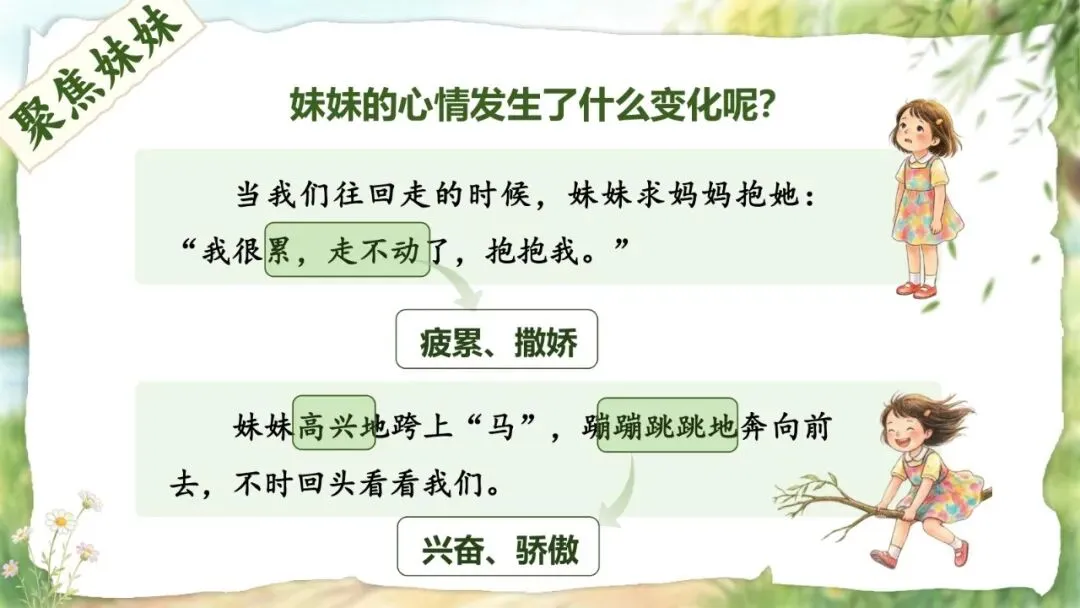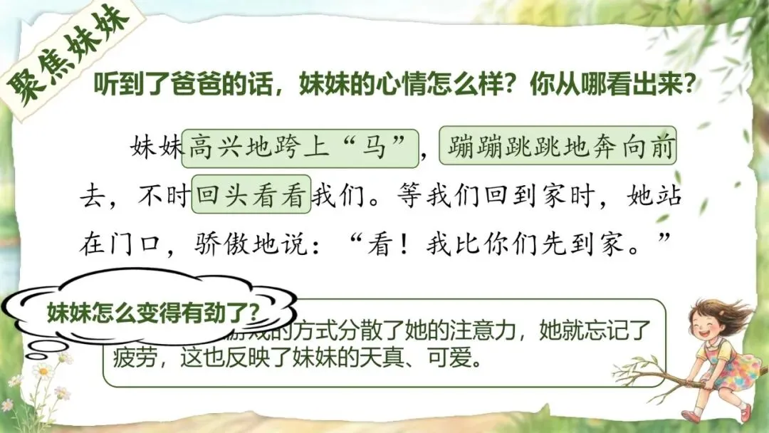 变化的原因:爸爸把一根又长又细的柳树枝条当作"一匹出色的马"送给妹妹,妹妹骑上"马"觉得有趣、新奇,沉浸在"骑马"的快乐游戏中,忘记了疲累,所以变得兴奋活泼,并因为先到家而感到骄傲。
