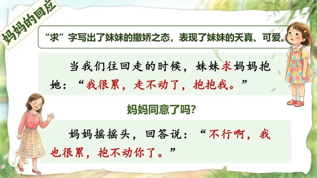 •第一句:妹妹很累,走不动,想让妈妈抱,表现出疲惫和撒娇的心情。
