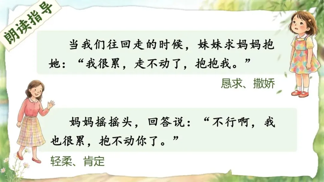 •"我很累,走不动了"——读得慢一点,声音小一点,表现妹妹的疲累;