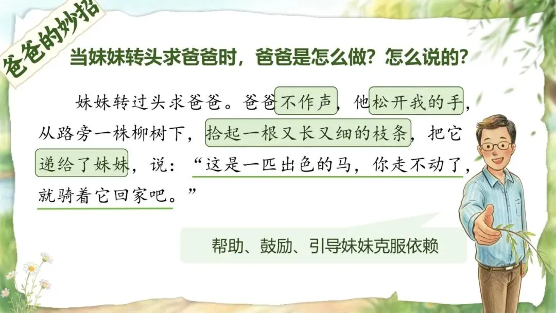 这一连串动作,说明爸爸在用心为妹妹想办法!爸爸说这根枝条是"一匹出色的马",他说话时是什么样的语气?(认真的、温柔的、带着鼓励的)