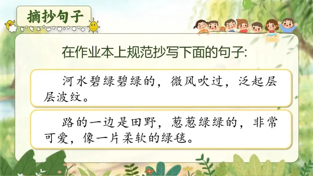 •找出描写郊外景色的句子,边读边想象画面,选一个句子抄写下来,积累生动词语。