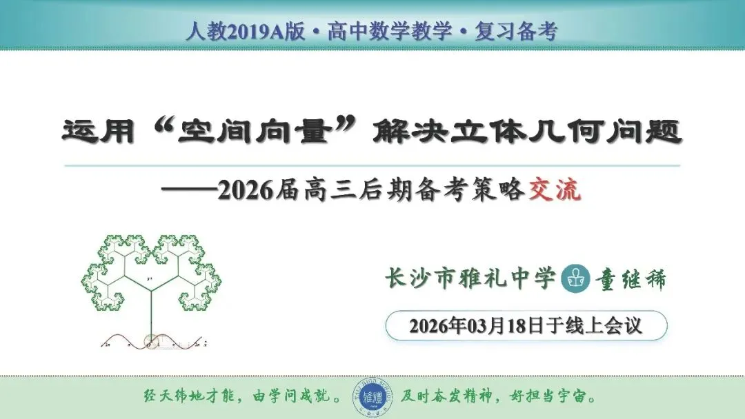在西安高新一中举办的“全国著名高中2026年高考后期备考策略研讨会”上,本人作了题为“运用空间向量解决立体几何问题”的主题讲座。现将课件分享给大家,欢迎交流指正!