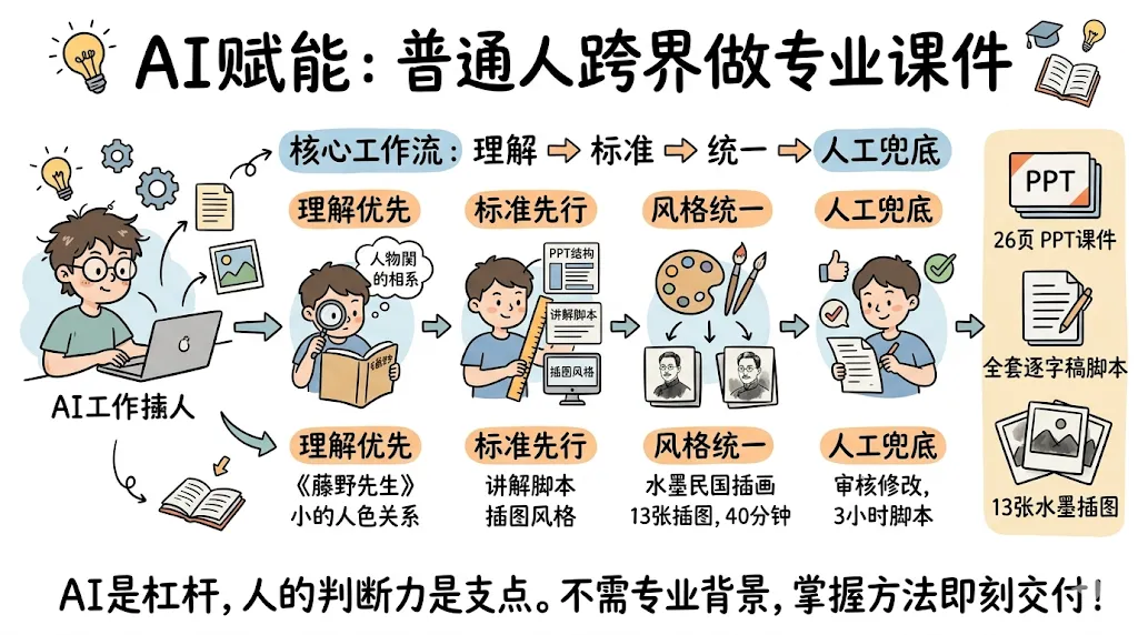 最后的结果是:26 页 PPT,全套逐字稿脚本,13 张 AI 生成的风格统一插图,交付时对方说:
