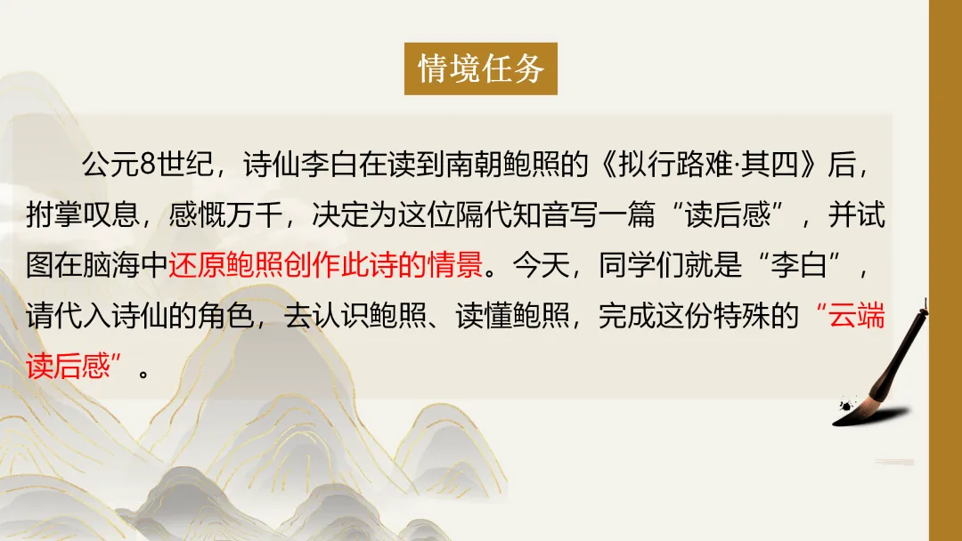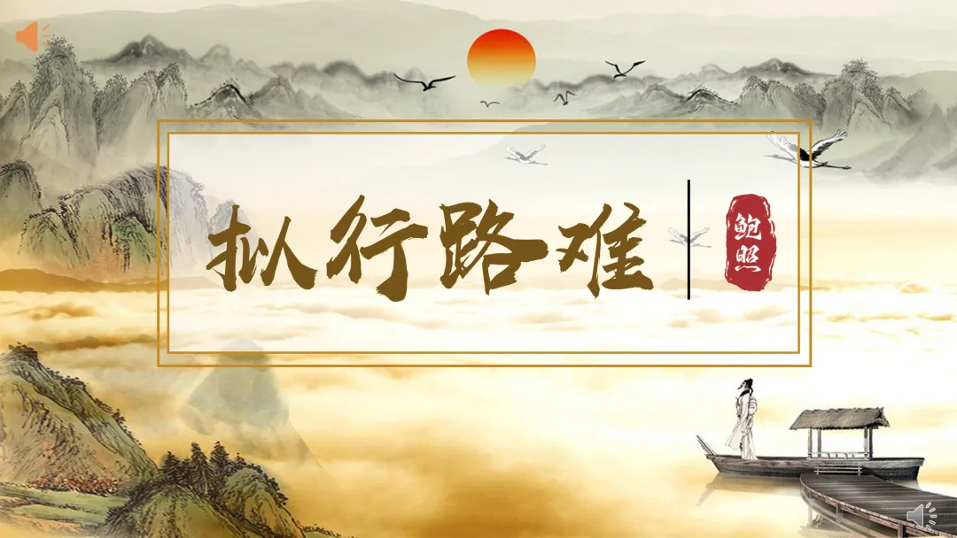 师:(播放一段音频,内容为:当李白读鲍照的《拟行路难》)公元8世纪的一个夜晚,诗仙李白在灯下读到一组诗,读着读着,他拊掌叹息,感慨万千。这组诗,就是南朝鲍照的《拟行路难》。李白决定为这位隔代知音写一篇“读后感”,并试图在脑海中还原鲍照创作此诗的情景。