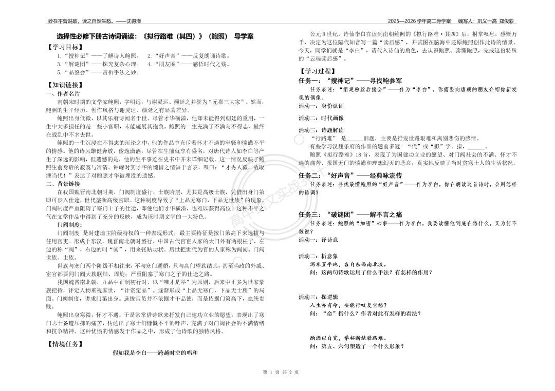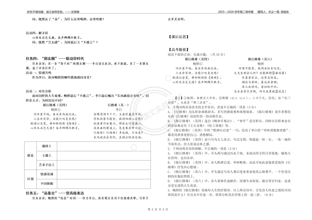 师:太棒了!从高潮到断崖式下跌,这就是鲍照的内心挣扎。带着这种感觉,我们齐读全诗。