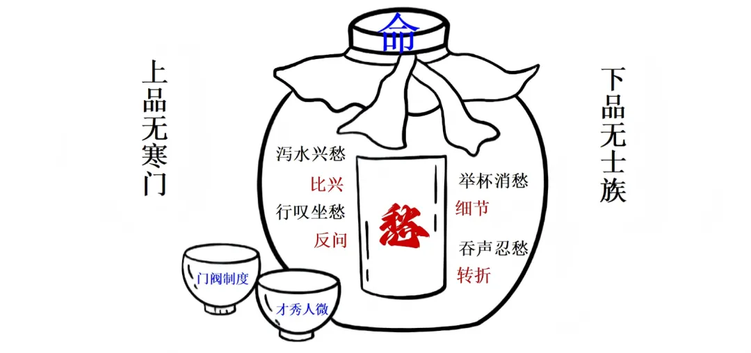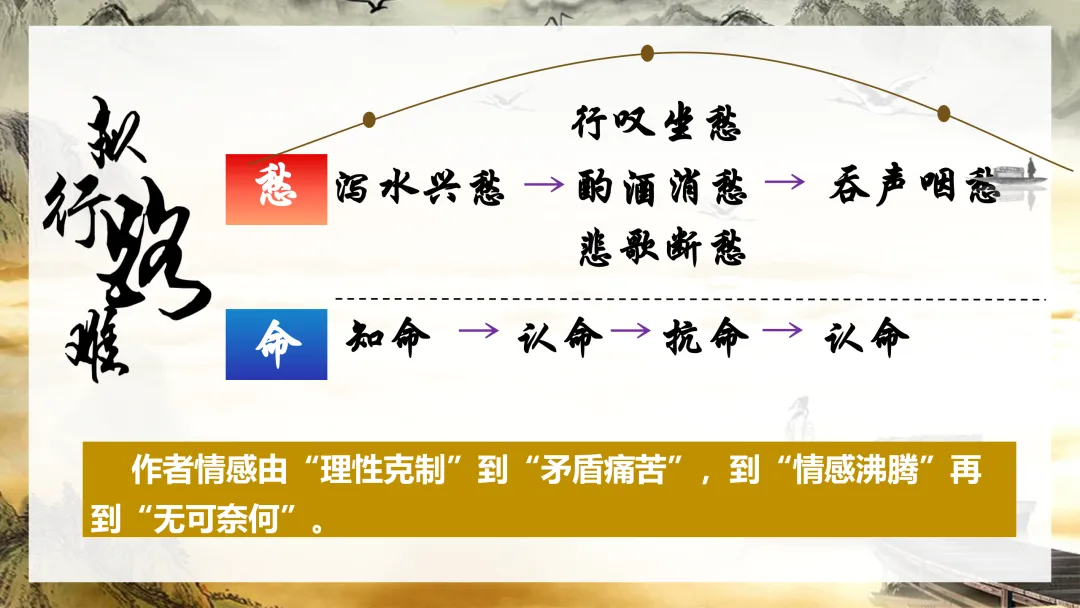 师:这就是鲍照最深的悲哀——连愤怒的权利都没有。我们梳理一下全诗的“愁”线:(板书)泻水兴愁——行叹坐愁——酌酒消愁——吞声咽愁。再看他对“命”的态度:(板书)知命——认命——抗命——认命。到了最后,已经不是个人命运,而是整个时代寒门士子的共同命运。(板书“泻水兴愁——行叹坐愁——酌酒消愁——吞声咽愁”)