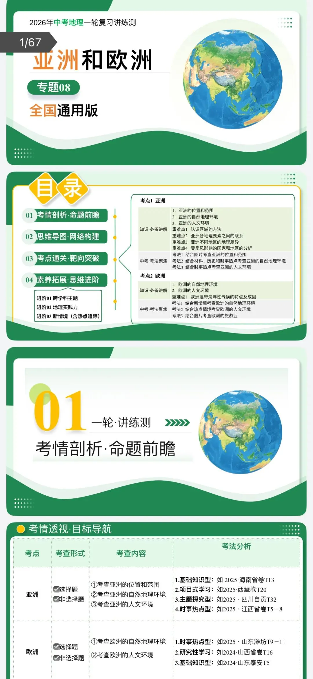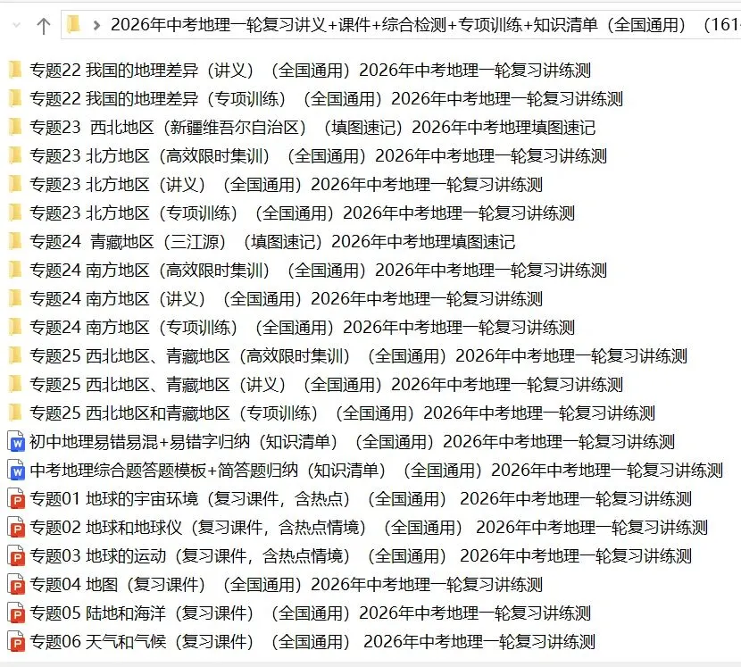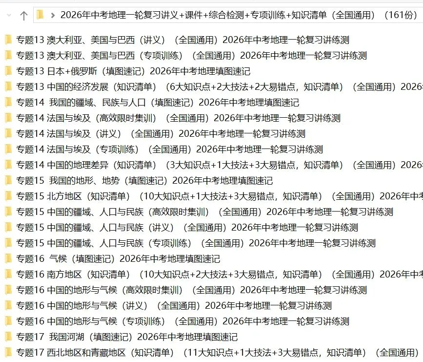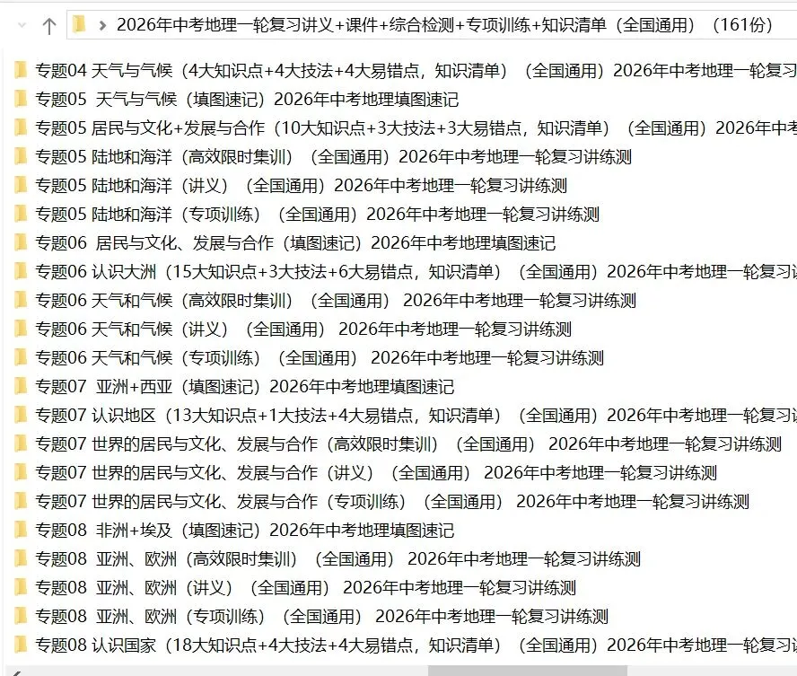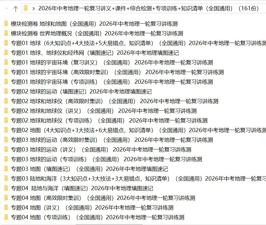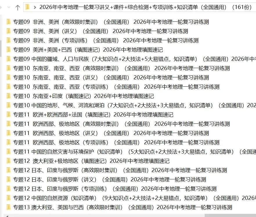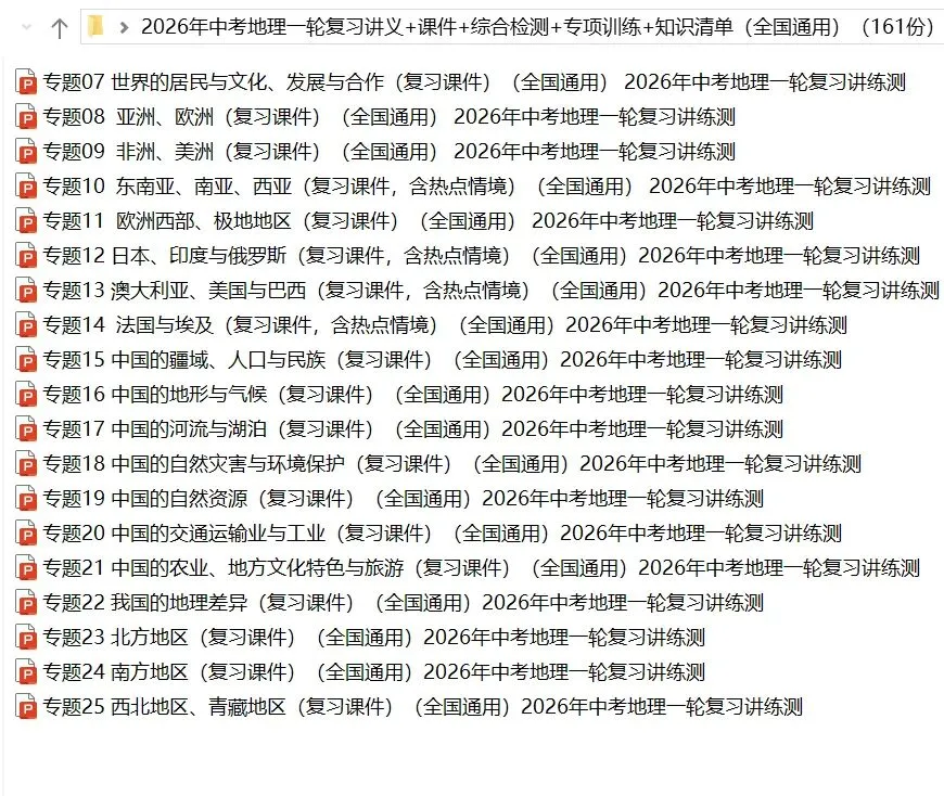 眼看中考的脚步越来越近,不少学校都开始组织总复习练习了,在考试总复习阶段,除了对课本知识进行掌握复习,更为重要的是一定要提前招几套难度题型全面的试卷练一练,,所以这里老师便整理了2026年中考地理:一轮复习(课件+讲义+练习+试卷),一份内容搞定所有考点,教师、学生都能用!希望能够帮助到大家。本文展示其中一部分内容,需要其他试卷、或是其他教材版本,可咨询联系老师(xu18619)注:会员群内的各位老师、家长可直接在群内领取~(有任何问题都可联系管理老师:xu18619咨询)完整内容: