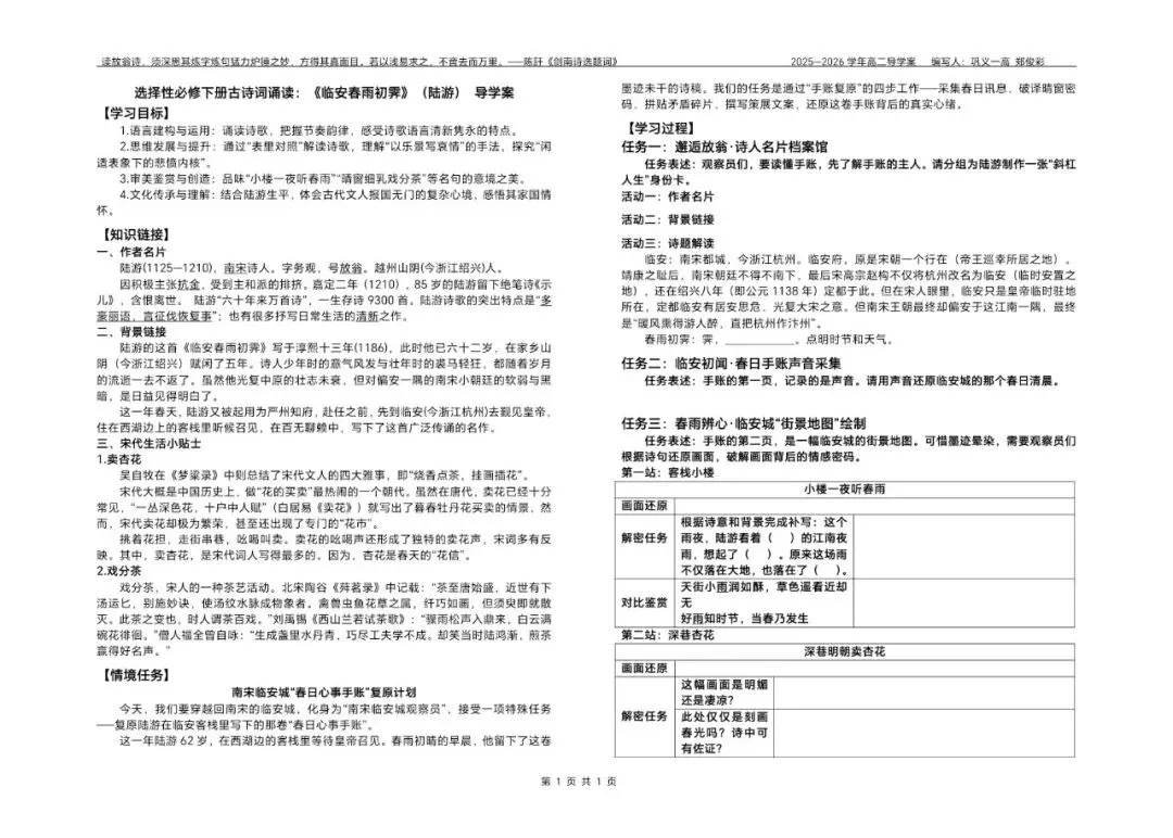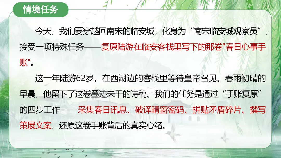 师:同学们,过年好!今年春晚的《立春》节目用现代美学演绎了春日生机,让人印象深刻。今天,我们要穿越回八百多年前的南宋临安城。请大家化身为“南宋临安城观察员”,去完成一项特殊任务——复原陆游在西湖客栈里写下的那卷“春日心事手账”。