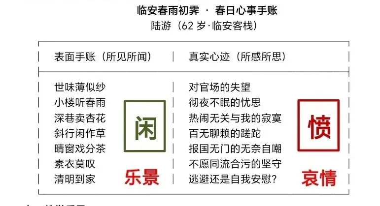从“小楼一夜听春雨”的彻夜无眠,到“晴窗细乳戏分茶”的百无聊赖,我们读懂了这位62岁诗人藏在闲适表象下的悲愤。表面是临安春雨的清新画卷,内里却是一个战士报国无门的苍凉独白。