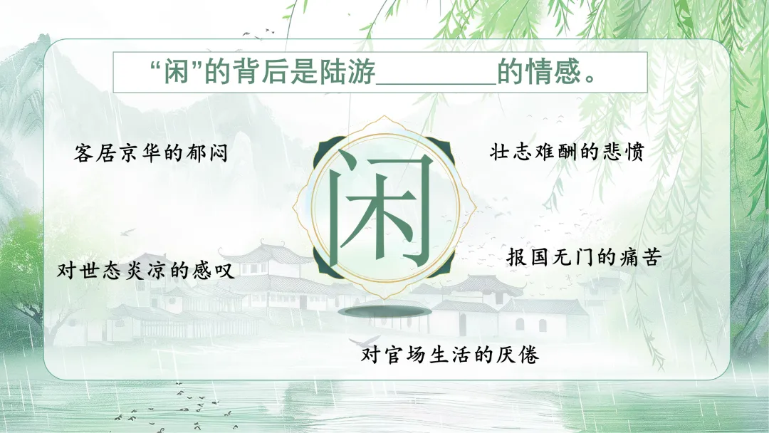 师:一语中的!一个“戏”字,看似悠闲,实则是对这种无聊生活的戏谑和无奈。表面上是极闲适的,背后藏着的却是诗人无限的感慨与牢骚。这就是我们今天要破解的核心密码——闲适表象下的悲愤内核。