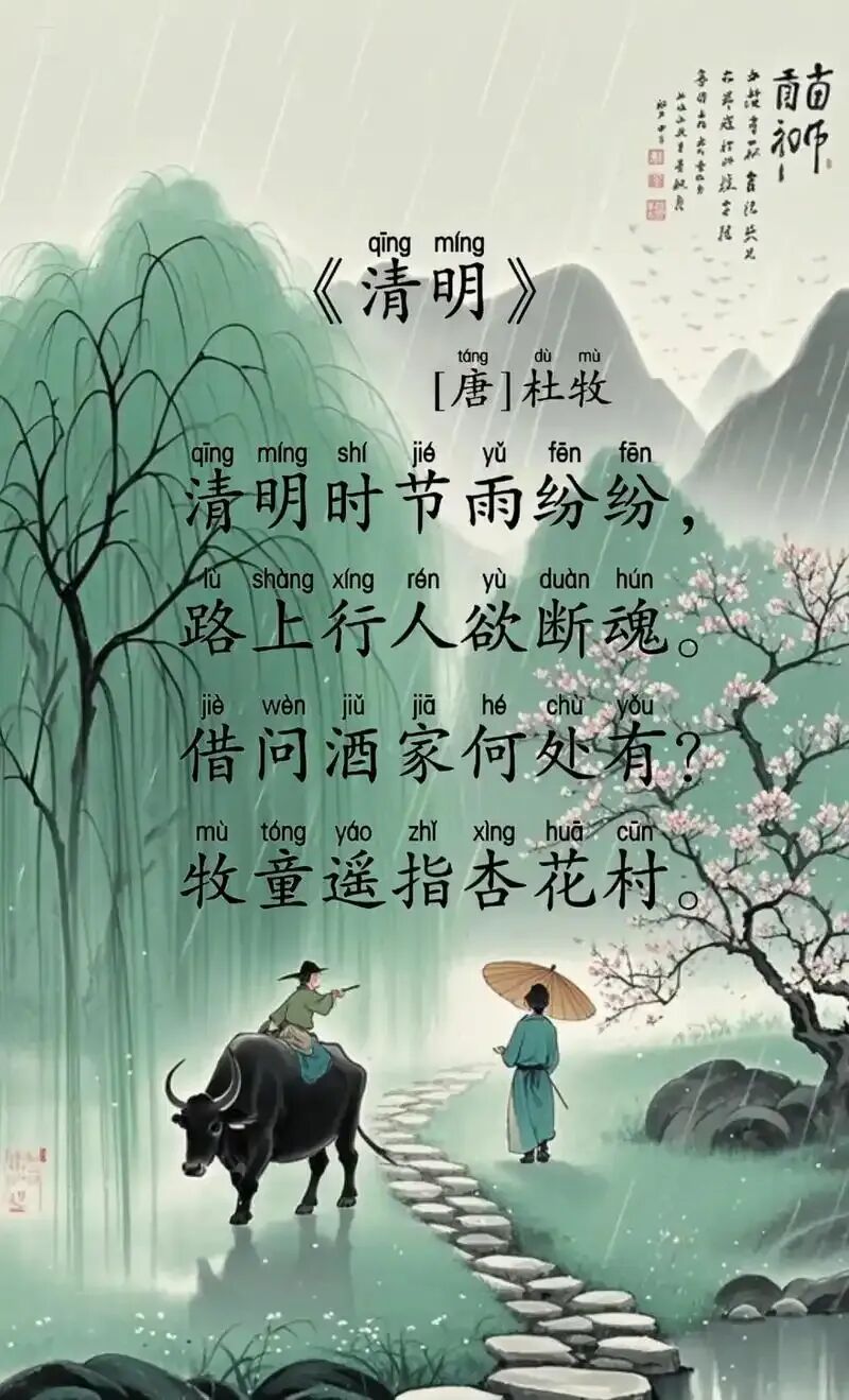 2.教师总结:清明节是人们踏春扫墓的日子,古时候啊,有一位叫做杜牧的诗人啊,就在这天写了一首诗,让我们一起来看一下吧,好不好?
