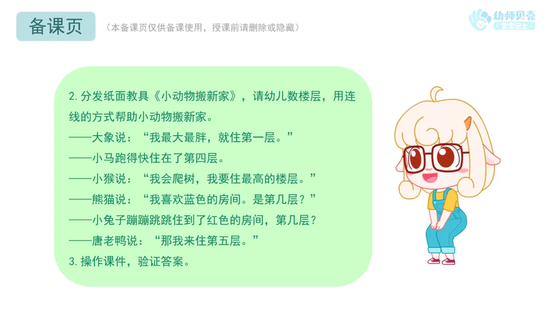 2.分发纸面教具《小动物搬新家》,请幼儿数楼层,用连线的方式帮助小动物搬新家。