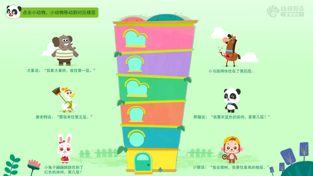 1.播放图片“小动物的新家”,请幼儿参观小动物的新家,认识楼层。