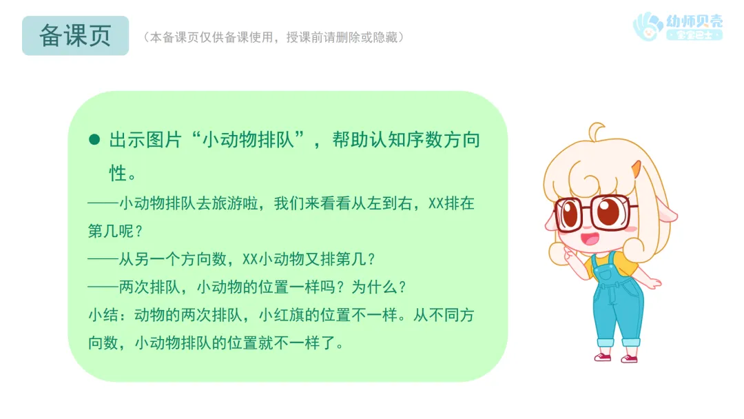 l出示图片“小动物排队”,帮助认知序数方向性。