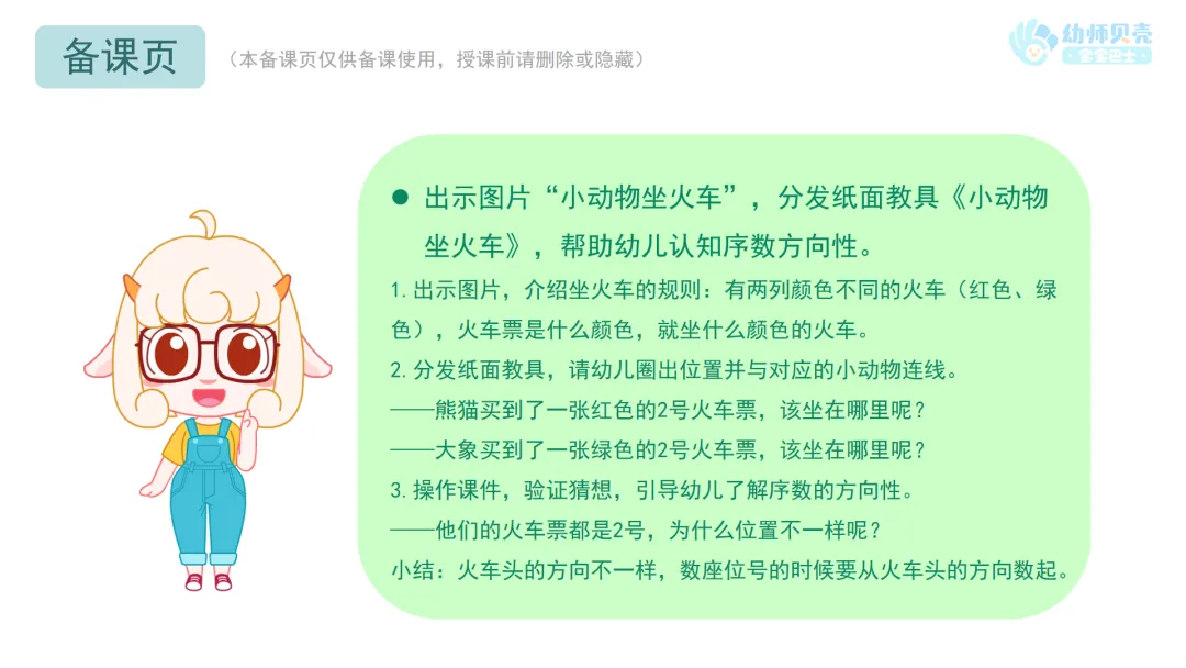 l出示图片“小动物坐火车”,分发纸面教具《小动物坐火车》,帮助幼儿认知序数方向性。