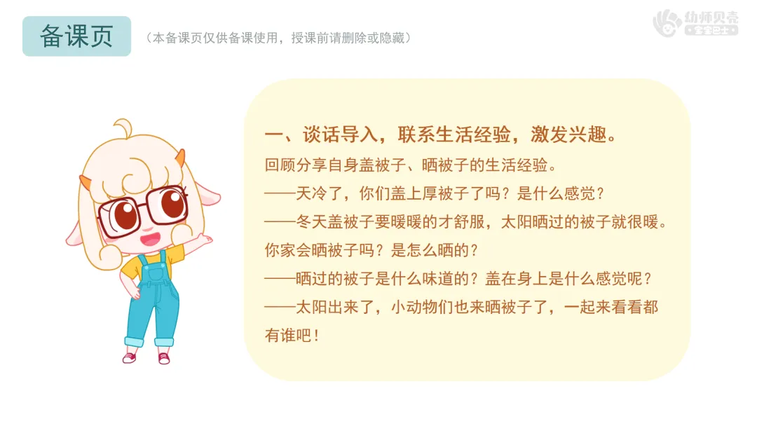 l理解故事内容,通过动物们的表达了解晒被子的作用。