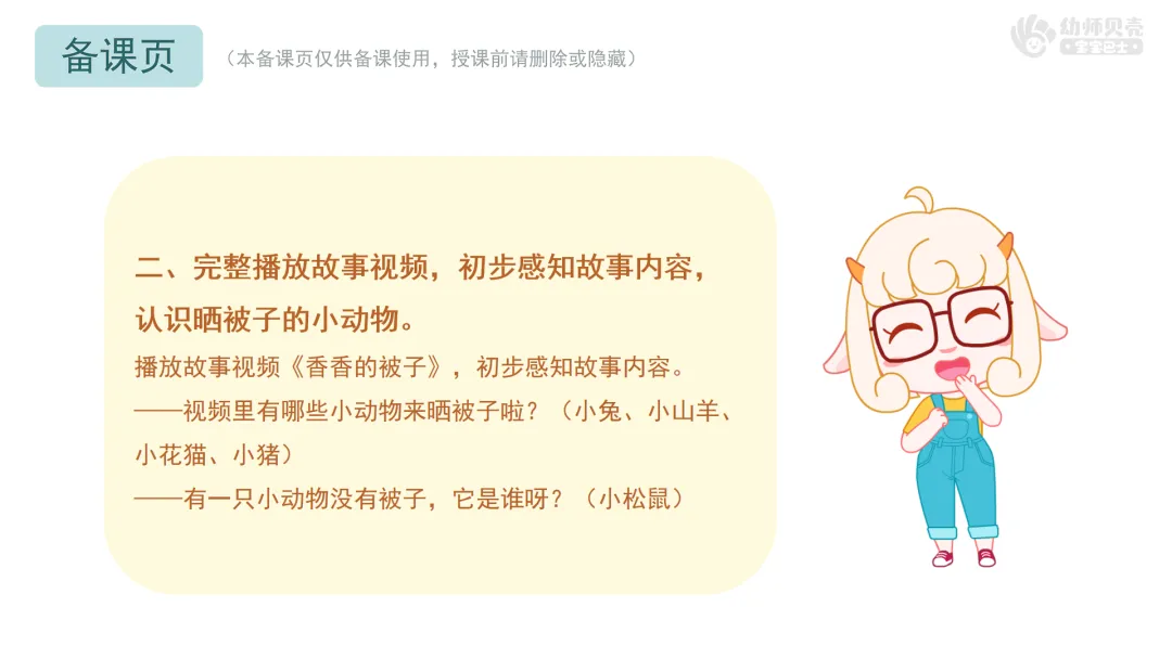 二、完整播放故事视频,初步感知故事内容,认识晒被子的小动物。