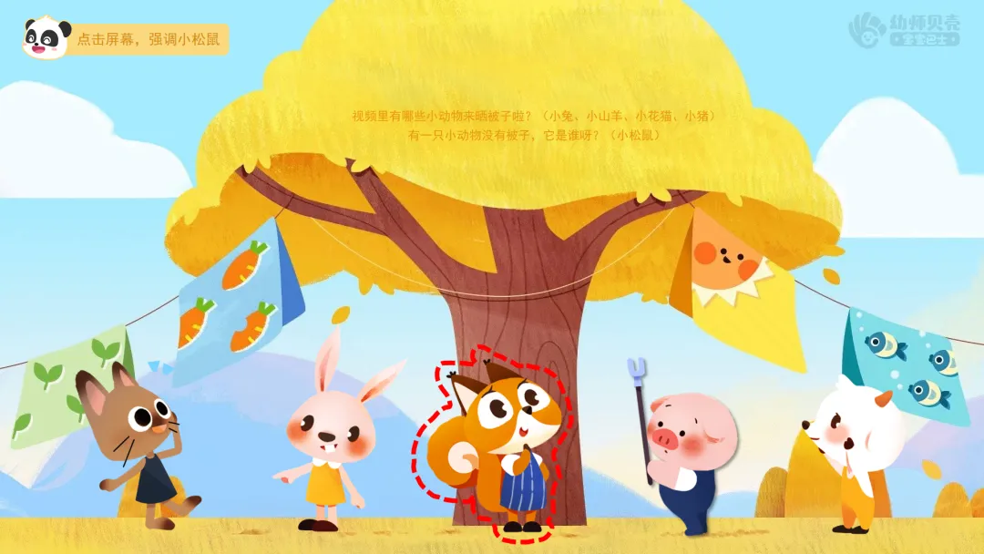 ——有一只小动物没有被子,它是谁呀?(小松鼠)
