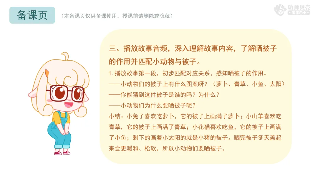 三、播放故事音频,深入理解故事内容,了解晒被子的作用并匹配小动物与被子。