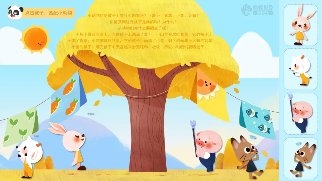 小结:小兔子喜欢吃萝卜,它的被子上画满了萝卜;小山羊喜欢吃青草,它的被子上画满了青草;小花猫喜欢吃鱼,它的被子上画满了小鱼;剩下的画着小太阳的就是小猪的被子。晒完被子冬天盖起来会更暖和、松软,所以小动物们要晒被子。