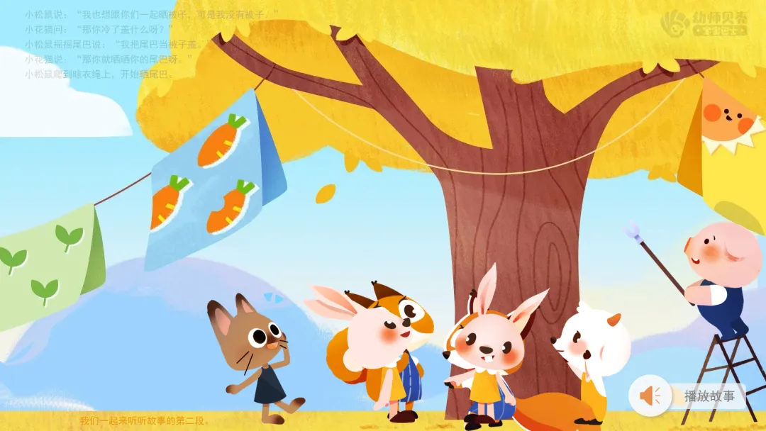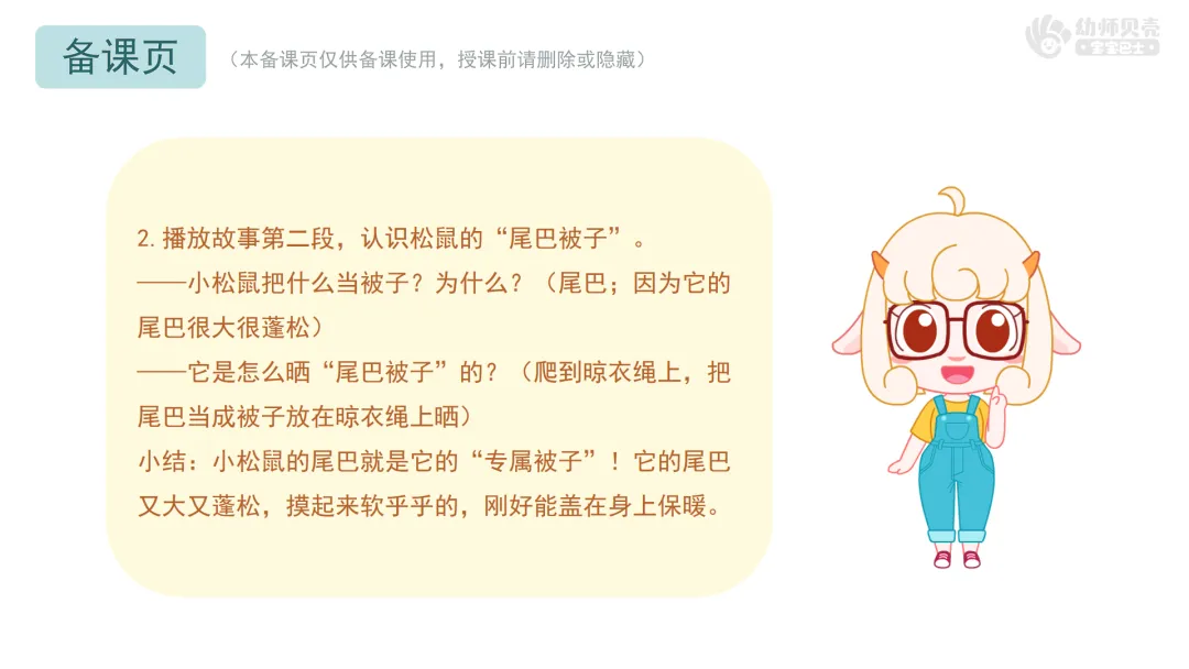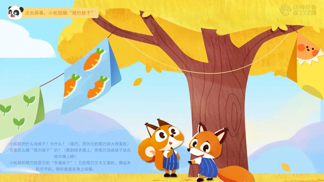 2.播放故事第二段,认识松鼠的“尾巴被子”。