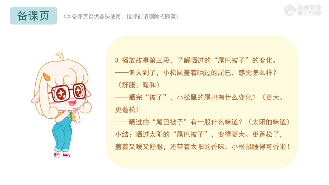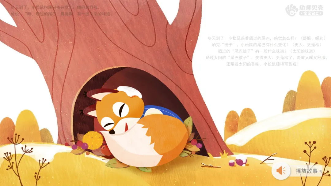 小结:晒过太阳的“尾巴被子”,变得更大、更蓬松了,盖着又暖又舒服,还带着太阳的香味,小松鼠睡得可香啦!